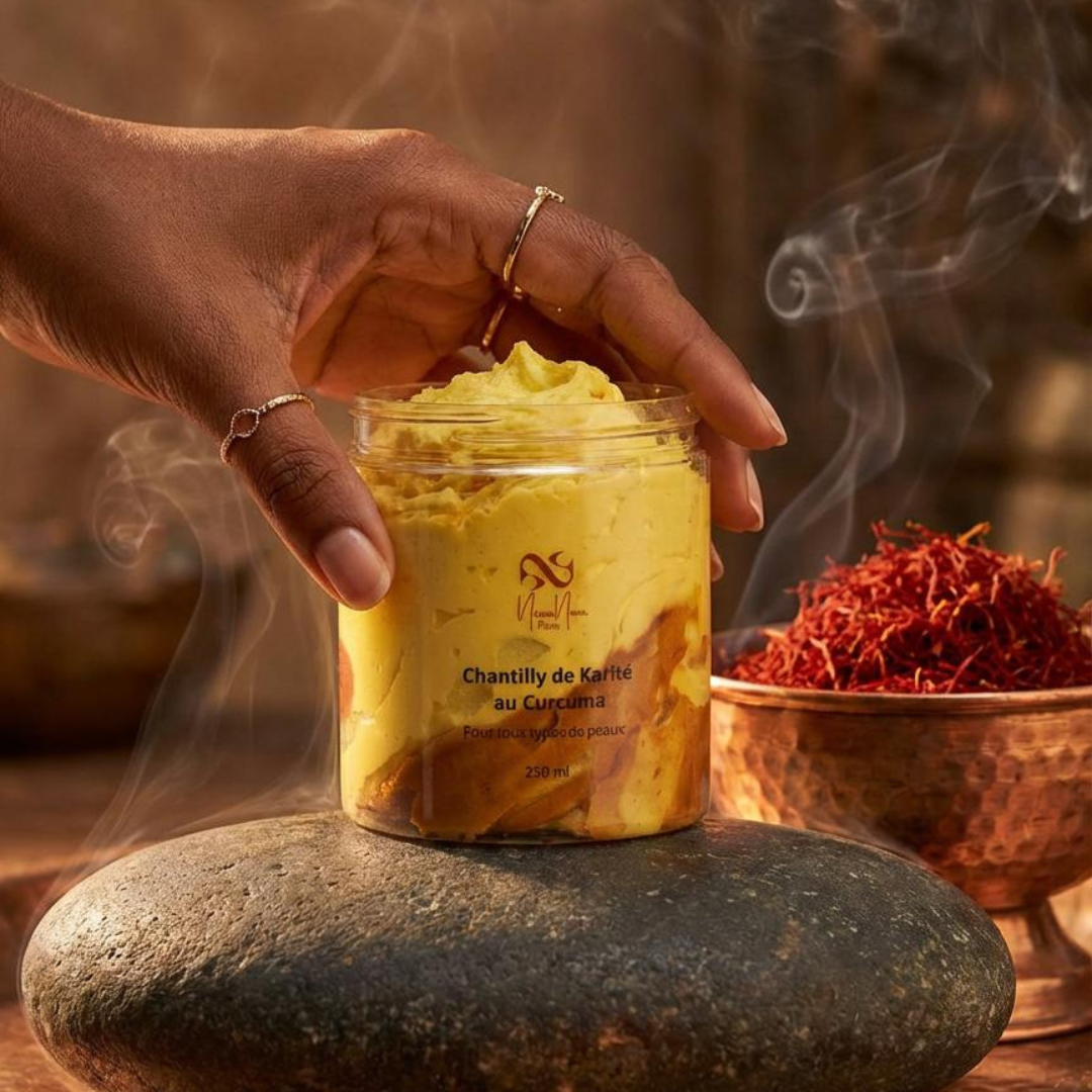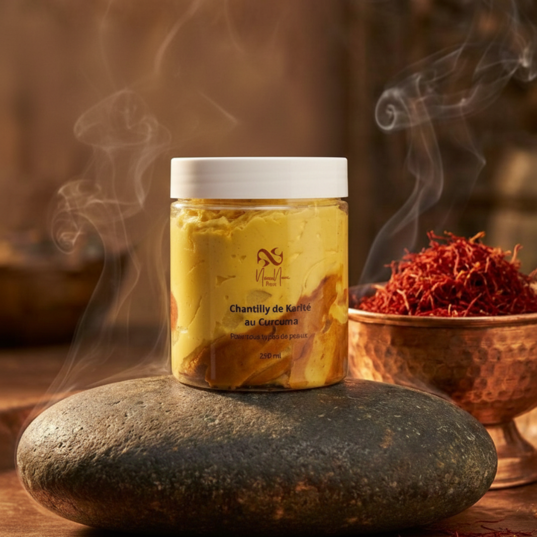 Découvre notre Chantilly de Karité au Curcuma au senteurs exotiques, un soin fouetté ultra nourrissant qui fond sur la peau et les cheveux